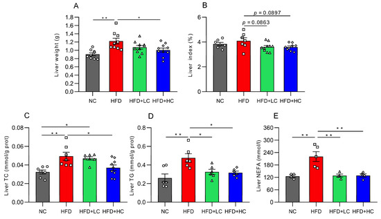 Impact of Ct on lipid accumulation in mice liver at 17 weeks of age. (A) Liver weight; (B) liver index; (C) liver TC level; (D) liver TG level; (E) liver NEFA level. The gray bars and open circles (○) represent the NC group, red bars and open squares (□) represent the HFD group, green bars and open triangles (△) represent the HFD + LC group, and blue bars and open rhombus (◇) represent the HFD + HC group. Data are represented as mean ± SEM and analysis with one-way ANOVA was performed, n = 4–10. * p < 0.05, ** p < 0.01.