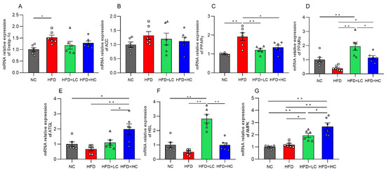 Interestingly, both the low- and high-dose C. tyrobutyricum treatment significantly downregulated the HFD-induced mRNA expression of PPARγ (p < 0.01, p < 0.05, respectively). However, AMPK, PPARα, and HSL mRNA levels were considerably higher in the HFD + LC group than in the HFD group. Similarly, there was an increase in the levels of AMPK, ATGL, and PPARα mRNA expression after the high concentration of Ct treatment. Thus, this suggested that Ct can regulate lipid metabolism.