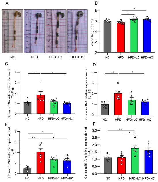 Effects of Ct on colon inflammation in mice. (A) Pictures of the colon; (B) colon length (cm); (C) mRNA expression of colon TNF-α; (D) mRNA expression of colon IL-1β; (E) mRNA expression of colon IL-6; (F) mRNA expression of colon IL-10. The gray bars and open circles (○) represent the NC group, red bars and open squares (□) represent the HFD group, green bars and open triangles (△) represent the HFD + LC group, and blue bars and open rhombus (◇) represent the HFD + HC group. Data are represented as mean ± SEM and were analyzed using one-way ANOVA, n = 5–7. * p < 0.05, ** p < 0.01.