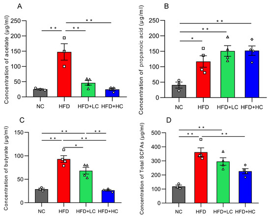 Effects of Ct on the concentration of SCFAs in colon content. (A) The concentration of acetate; (B) the concentration of propanoic; (C) the concentration of butyrate; (D) the concentration of total SCFAs. The gray bars and open circles (○) represent the NC group, red bars and open squares (□) represent the HFD group, green bars and open triangles (△) represent the HFD + LC group, and blue bars and open rhombus (◇) represent the HFD + HC group. Data are expressed as mean ± SEM and were analyzed using one-way ANOVA, n = 3–4. * p < 0.05, ** p < 0.01.