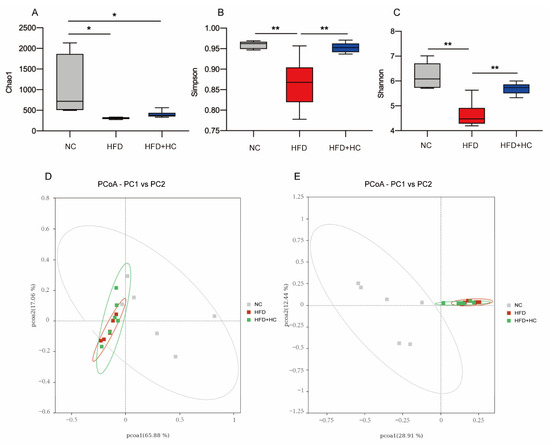 Alpha diversity and principal coordinates analysis of cecum content in mice. (A) Chao1 index; (B) Simpson index; (C) Shannon index; (D) PCoA analysis based on weighted Unifrac distance; (E) PCoA analysis ground on unweighted Unifrac distance. Data are represented as mean ± SEM and were analyzed using one-way ANOVA, n = 5–6. * p < 0.05, ** p < 0.01.
