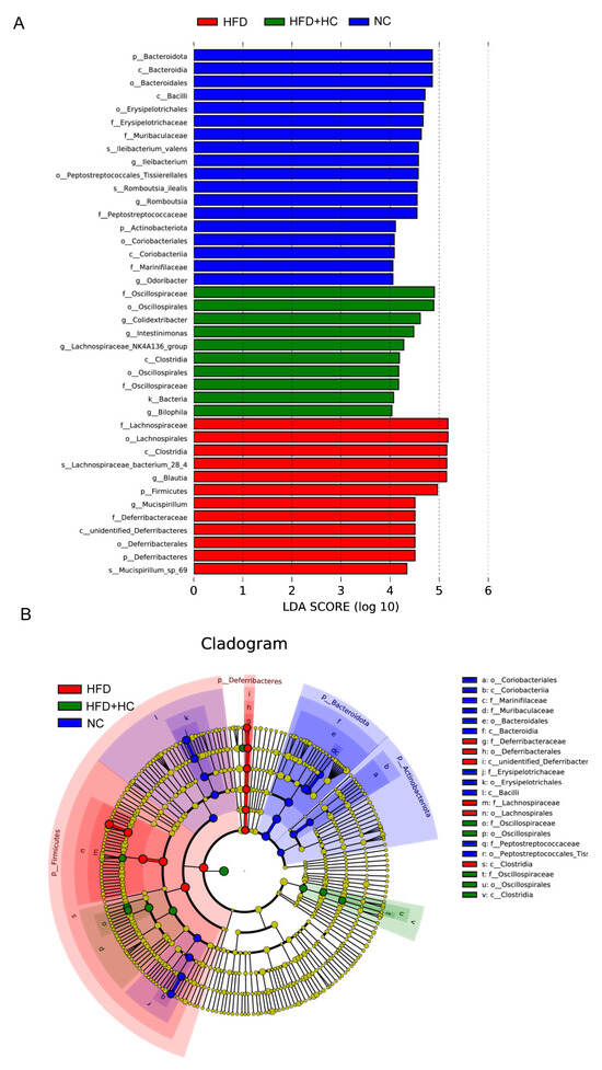 LEfSe analysis of microbiota in mice cecum content. (A) LEfSe analysis distribution histogram with an LDA score greater than 4. The red bars represent the HFD group, green bars represent the HFD + HC group, and blue bars represent the NC group; (B) cladogram generated from LEfSe analysis. Species with no significant differences are uniformly colored yellow. The red node indicates the microbial groups that play an important role in the HFD group, the green node indicates the microbial groups that play an important role in the HFD + HC group, and the blue node indicates the microbial groups that play an important role in the NC group.