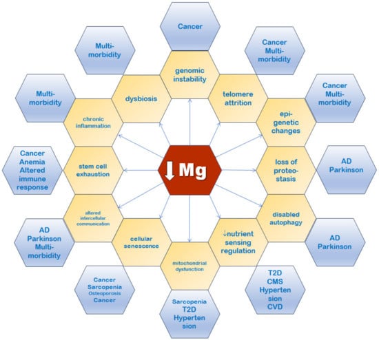 Low magnesium status is associated with all the hallmarks of aging (yellow). Examples of age-related diseases connected with the hallmarks of aging are shown in blue. AD: Alzheimer’s disease; CMS: cardiometabolic syndrome; CVD: cardiovascular disease; and T2D: type 2 diabetes.
