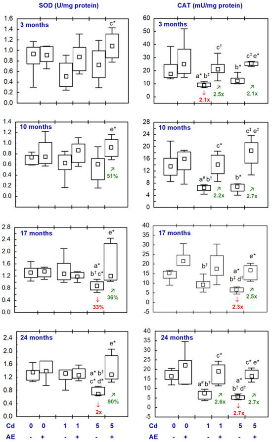 The brain activity of SOD in the females maintained on the 1 mg Cd/kg diet alone (the Cd1 group) and together with the supplementation with AE (the Cd1 + AE group) for 3–24 months was within the range of values determined in the control animals (Figure 2, Table S3). In the Cd5 group, the activity of this enzyme after 17 and 24 months was lower (by 33% and 2-fold, respectively), whereas a shorter exposure to cadmium did not influence this parameter (Figure 2, Table S3). In the females co-administered cadmium in the diet at the concentration of 5 mg/kg and AE, the activity of SOD after 10, 17, and 24 months was higher (by 36–90%) than in the corresponding group receiving only cadmium. No difference in the activity of SOD between the Cd5 + AE and control groups throughout the study was noted (Figure 2, Table S3).