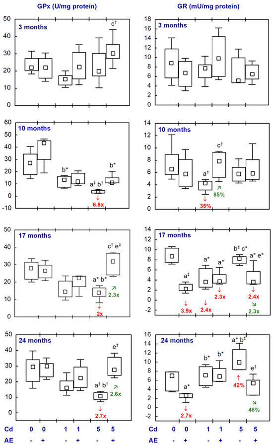 The brain activity of GPx in the Cd1 group was unchanged, whereas GR activity was decreased after 10 and 17 months (by 35% and 2.4-fold, respectively) and unaffected after 3 and 24 months (Figure 3, Table S4). The rats treated with the 5 mg Cd/kg diet had lower activity of GPx after 10–24 months (from 2- to 6.8-fold) and higher GR activity after 24 months (by 42%) (Figure 3, Table S4). In the rats supplemented with AE and exposure to 1 and 5 mg Cd/kg diet, the activities of both enzymes were within the proper values assayed in the control females, except for a lower activity of GR after 17 months (2.3- and 2.4-fold, respectively) (Figure 3, Table S4). After 17 and 24 months, the brain activity of GPx in the Cd5 + AE group exceeded (2.3- and 2.6-fold, respectively) the activity of this enzyme determined in the Cd5 group, while GR activity was lower in the former group (2.3-fold and by 46%, respectively) (Figure 3, Table S4).