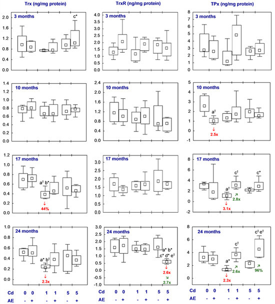 The brain concentrations of Trx, TrxR, and TPx did not differ between the Cd1 and Cd5 groups or between the Cd1 + AE and Cd5 + AE groups, except for a lower (2.4-fold) value of TrxR after 24 months of supplementation with AE at the moderate exposure to cadmium than under the low-level treatment (Figure 4, Table S5).