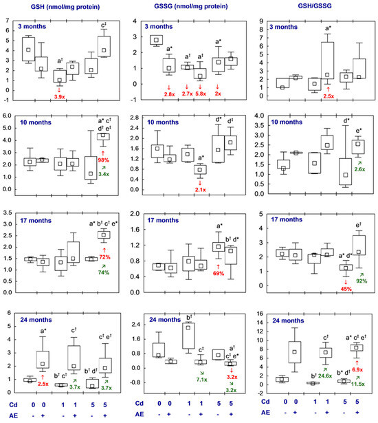 The brain concentrations of GSH and GSSG and their ratio did not differ between the Cd1 group and the Cd5 group, or between the Cd1 + AE group and the Cd5 + AE group. The only exception was a higher GSH concentration after 10 months (2.1-fold) and a higher GSSG concentration after 10 and 17 months (2.4-fold and by 58%, respectively) in the Cd5 + AE group than in the Cd1 + AE group (Figure 5, Table S6).