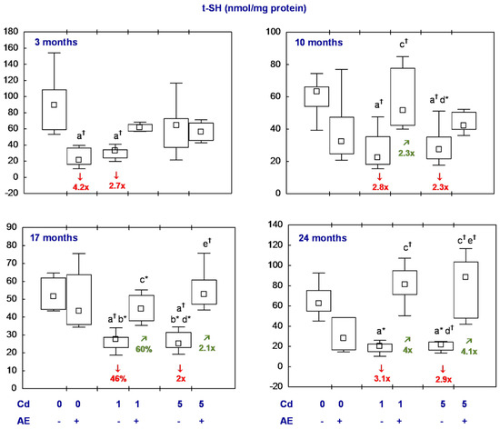 The concentration of t-SH in the females receiving AE alone did not differ from the control group, except for its lower (4.2-fold) value after the shortest administration of the extract (Figure 6, Table S7). In the Cd1 and Cd5 groups, the t-SH concentration was lower than in the control animals throughout the whole experiment (from 46% to 3.1-fold) with one exception. The concentration was unaffected due to the shortest, moderate treatment with cadmium. In the groups supplemented with AE under exposure to this harmful element, the concentration of t-SH was within the range of the control group throughout the study, and in the Cd1 + AE group, it reached a higher value than in the Cd1 group after 10, 17, and 24 months (2.3-fold, by 60%, and 4-fold, respectively), whereas in the animals co-administered the 5 mg Cd/kg diet and AE for 17 and 24 months it was higher (2.1- and 4.1-fold, respectively) than in these receiving this diet alone (Figure 6, Table S7).