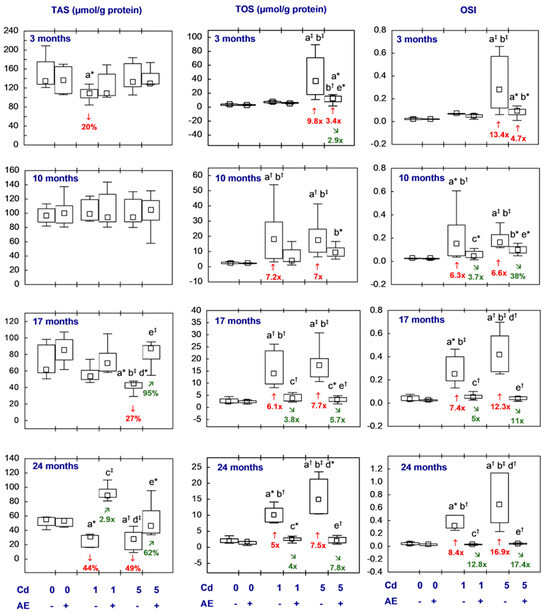 In the females subjected to AE supplementation under the treatment with cadmium (the Cd1 + AE and Cd5 + AE groups), TOS, TAS, and OSI were within the values noted in the control animals, with the exception of higher TOS and OSI after the shortest co-administration of the 5 mg Cd/kg diet and AE (3.4- and 4.7-fold, respectively). In the animals of the Cd5 + AE group, TAS after 17 months of the study exceeded (by 95%) the value determined in the Cd5 group, whereas this parameter after the 24-month supplementation with AE under exposure to cadmium (the Cd1 + AE and Cd5 + AE groups) exceeded the values noted in the respective groups treated with cadmium alone (2.9-fold and by 62%, respectively). For the co-administration of cadmium and AE, TOS and OSI, at numerous time points, reached values lower (from 38% to 17.4-fold) than in the case of no supplementation with this extract during the treatment with cadmium (Figure 7, Table S8).