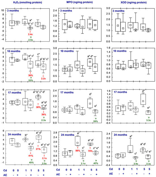 The brain concentrations of H2O2, MPO, and XOD did not differ between the low-level and moderate exposure to cadmium (the Cd1 group versus the Cd5 group) or between the groups supplemented with AE during the treatment with this toxic element (the Cd1 + AE group versus the Cd5 + AE group), except for the concentration of H2O2 in the animals fed the 5 mg Cd/kg diet alone, which after 10 months was lower and after 17 months was higher than with the low-level intoxication (the Cd5 group versus the Cd1 group) (by 37% and 32%, respectively) (Figure 8, Table S9).