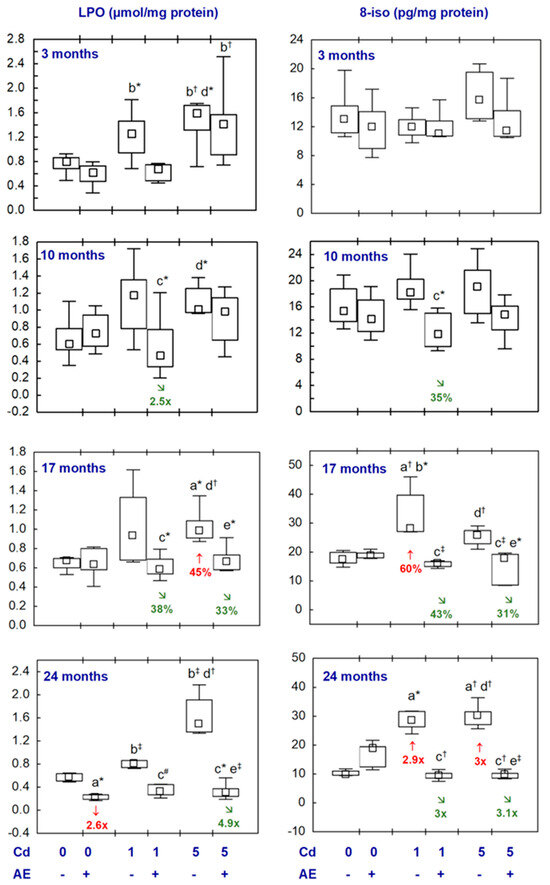 The concentrations of lipid peroxides (LPO) and 8-isoprostane (8-iso) in the brains of female rats treated with cadmium (Cd) (0, 1, or 5 mg Cd/kg diet) and/or 0.1% extract from A. melanocarpa L. berries (AE). Statistical differences from the: a—Control group, b—AE group, c—Cd1 group, d—Cd1 + AE group, and e—Cd5 group are marked as * p < 0.05, † p < 0.01, ‡ p < 0.001, and # p = 0.05. The differences in comparison to the control animals (↑, higher and ↓, lower) and the appropriate Cd group (↘, lower) are marked with the numerical values indicating a percentage difference or a fold of difference between the respective groups. The effect size (η2) for the differences in the concentrations of LPO and 8-iso between the experimental groups was large (0.240–0.820 and 0.210–0.770, respectively). Detailed data on the concentrations of LPO and 8-iso (including η2) are provided in Table S10.