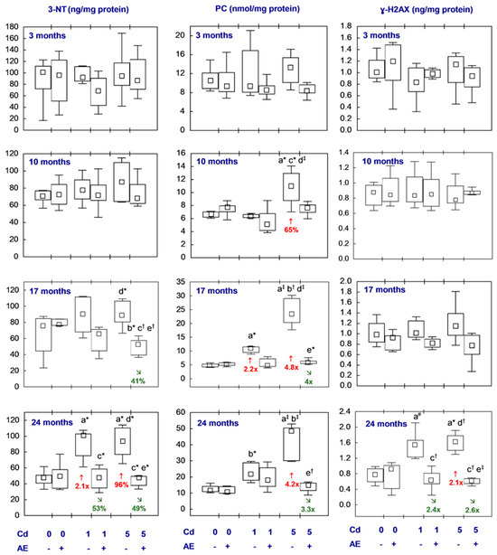 The concentrations of 3-nitrotyrosine (3-NT), protein carbonyl groups (PC), and ɣ-H2A histone family member X (ɣ-H2AX) in the brains of female rats treated with cadmium (Cd) (0, 1, or 5 mg Cd/kg diet) and/or 0.1% extract from A. melanocarpa L. berries (AE). Statistical differences from the: a—Control group, b—AE group, c—Cd1 group, d—Cd1 + AE group, and e—Cd5 group are marked as * p < 0.05, † p < 0.01, ‡ p < 0.001, and # p = 0.05. The differences in comparison to the control animals (↑, higher) and the appropriate Cd group (↘, lower) are marked with the numerical values indicating a percentage difference or a fold of difference between the respective groups. The effect size (η2) for the differences in the concentrations of 3-NT, PC, and ɣ-H2AX between the experimental groups was large (0.420–0.520, 0.390–0.650, and 0.640, respectively). Detailed data on the concentrations of 3-NT, PC, and ɣ-H2AX (including η2) are provided in Table S11.