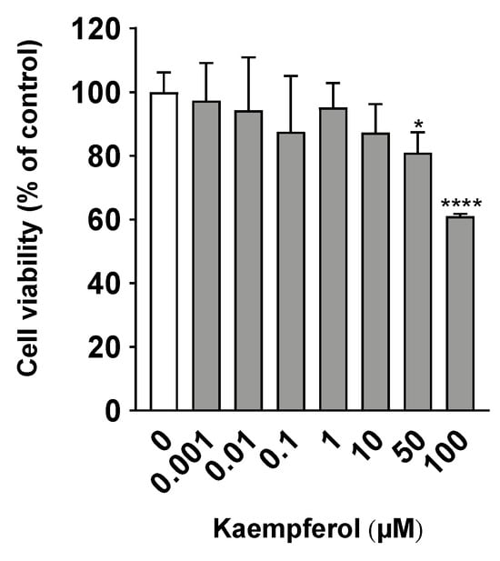 Effects of kaempferol on cell viability in C3A cells. Cell viability was measured using the WST-1 assay. Values are presented as means ± standard deviations (SDs) (n = 6 per group). * p < 0.05, **** p < 0.0001 vs. 0 µM of kaempferol using one-way analysis of variance (ANOVA) with Dunnett’s multiple comparisons test.