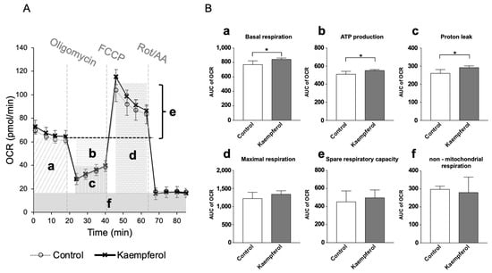 Effects of kaempferol on mitochondrial function in C3A cells. (A) Mitochondrial respiratory profile. Oxygen consumption rate (OCR) was measured over time (pmol/min) using an extracellular flux analyzer. Each reagent of the Mito Stress Test Kit (oligomycin, carbonyl cyanide 4-(trifluoromethoxy) phenylhydrazone [FCCP], or rotenone and antimycin A [Rot/AA]) was injected into each well stepwise. (B) The parameters were calculated according to each OCR value on mitochondrial oxidative phosphorylation, including (a) basal respiration, (b) ATP production, (c) proton leak, (d) maximal respiration, (e) spare respiration capacity, and (f) non-mitochondrial respiration. Values are presented as means ± standard deviations (SDs) (n = 4–5 per group). * p < 0.05, unpaired t-test.