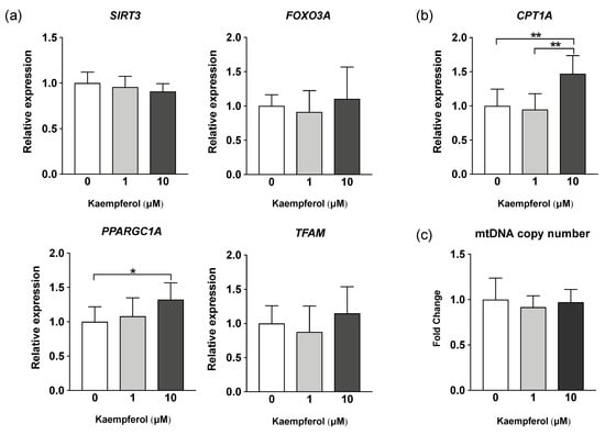 Effect of kaempferol on the expression of mitochondrial metabolism-related genes in C3A cells. (a) mRNA expression levels of mitochondrial biogenesis-related genes determined by real-time PCR. β-actin was used as a housekeeping control for each target gene. (b) mRNA expression levels of β-oxidation-related genes determined by real-time PCR. β-actin was used as a housekeeping control. (c) Mitochondrial DNA copy number determined by real-time PCR. GAPDH expression level was used as a control for nuclear DNA. All values are indicated as the relative expression compared with control group values, which were set to 1.0 (mean ± standard deviation [SD], n = 8 per group). * p < 0.05, ** p < 0.01, one-way analysis of variance (ANOVA) with Tukey’s multiple comparisons test.