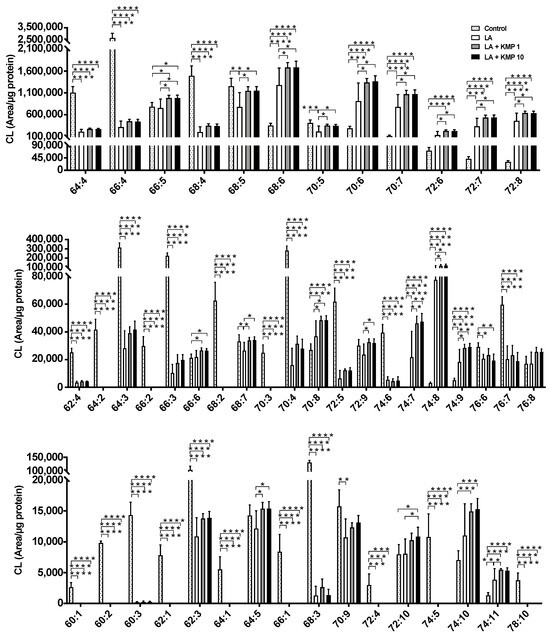 Forty-eight CL species were detected in C3A cells of the fatty liver model (Figure 4). As expected, the CL72:8 levels were markedly increased by LA supplementation. Furthermore, CL72:8 levels were elevated in both the LA + KMP1 and LA + KMP10 groups compared to the LA group. The levels of CL molecular species with 5–9 double bonds were significantly increased in the LA + KMP1 and LA + KMP10 groups compared to the LA group. Total CL level was also significantly increased in the LA + KMP1 and LA + KMP10 groups compared to the LA group (Figure 5).
