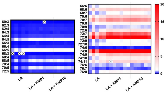 Heat map of cardiolipin (CL) species in the linoleic acid (LA)-loaded fatty liver cell model supplemented with or without KMP. With respect to color intensities, the mean values of each CL species in the control group are expressed as 1.0. Individual results for the samples are represented (n = 6 for each group). The cross mark means undetected CL species.