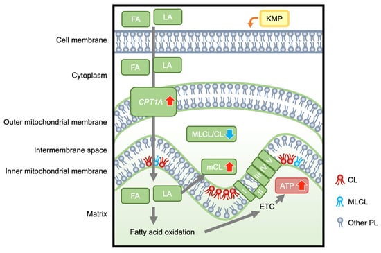 CL72:8 was formed by supplying LA to the fatty liver cell model; however, LA supplementation decreased the total CL level. The present study demonstrated that the addition of KMP increased not only CL72:8 but also the total amount of CL, indicating that KMP could promote the CL synthesis pathway. This is consistent with the finding that KMP promotes LA uptake via CPT1A. Previous studies have shown that CL is required for maintaining CPT1 activity and ATP production [38,39]. Overall, the KMP-induced increase in the total amount of CL and the improvement in the quality of CL molecular species may have led to mitochondrial activation.