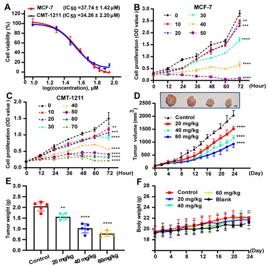 This study was approved by the Institutional Ethical Committee for Animal Care and Use of Huazhong Agricultural University (permit number: HZAUMO-2023-0259). All the experimental procedures adhered to the United States National Institutes of Health guidelines. Five-week-old Balb/C female mice were purchased from the Experimental Animal Center of Huazhong Agricultural University (Wuhan, China) and maintained in standard conditions for one-week adaptation. Approximately 1 × 106 CMT-1211 cells were harvested and suspended in 100 μL of PBS, then subcutaneously injected into the mouse’s fourth mammary pad. Next, mice were randomized into four groups, the control group (PBS), low-dose group (20 mg/kg), medium-dose group (40 mg/kg), and high-dose group (60 mg/kg), after the tumor volume reached about 100 mm3. Intraperitoneal injection and tumor volume and body weight measurement were performed every 2 days. Tumor volume was assessed using the following formula: V (mm3) = length × width2/2. Three weeks post-injection, all mice were euthanized, and the xenograft tumors were meticulously excised and weighed before being partly immersed with 4% paraformaldehyde and partly transferred to −80 °C for a subsequent analysis. The major organs were collected and immersed to perform hematoxylin and eosin (H&E) staining.