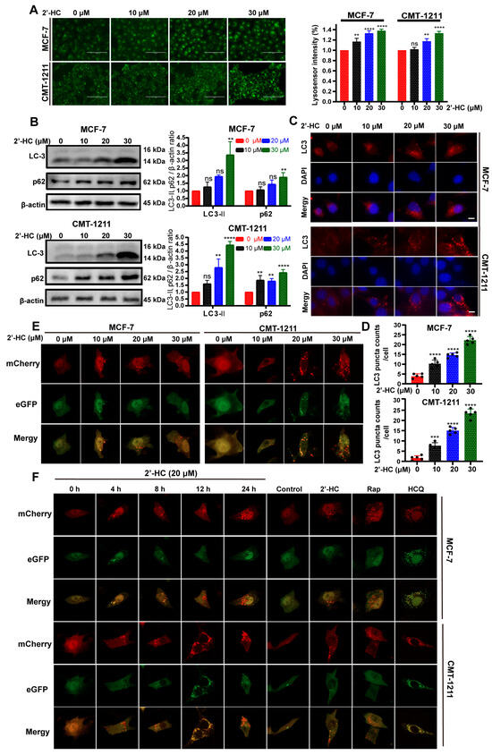 2’-HC induced autophagy and promoted autophagy flux in breast cancer cells. (A) The number of acidic vesicular organelles of MCF-7 and CMT-1211 cells was measured with lysosensor reagent after 2’-HC treatment, reflected by green fluorescence intensity within cells. Scale bar, 100 μm. Data were obtained from three independent experiments (n = 3). (B) Western blot analyses of LC-3 and p62 in cells treated with 2’-HC for 24 h. β-actin was used as an internal control. Data were obtained from three independent experiments (n = 3). (C,D) Immunofluorescence staining of LC3 in MCF-7 and CMT-1211 cells that were treated with 2’-HC for 24 h. Scale bar: 10 μm. Data were obtained from five independent experiments (n = 5). (E) The MCF-7 and CMT-1211 cells were transfected with a plasmid encoding mCherry-eGFP-LC3 and treated with 2’-HC for 24 h. Images were captured with confocal microscopy. Scale bar: 10 μm. (F) The MCF-7 and CMT-1211 cells were transfected with a plasmid encoding mCherry-eGFP-LC3 and treated with 20 μM 2’-HC for 4, 8, 12, 24 h. Treatment with Rapamycin (Rap, 1 μM) and Hydroxychloroquine (HCQ, 20 μM) for 24 h was used as positive and negative controls, respectively. Scale bar: 10 μm. Data are presented as the mean ± SD. ** p < 0.01, *** p < 0.001, **** p < 0.0001, ns (not significant; p ≥ 0.05).