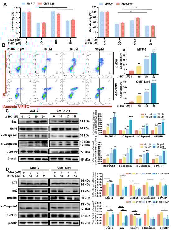 2’-HC induced autophagy-dependent apoptosis of breast cancer cells. (A) Cell viability of MCF-7 and CMT-1211 cells was assessed after treatment of 2’-HC (30 μM) or Rapamycin (Rap, 2 μM)/3-Methyladenine (3-MA, 5 mM) or their combination with Cell Counting Kit-8 kits. Cells were pretreated with Rap for 1 h and 3-MA for 2 h before treatment with 2’-HC for 24 h. (B) Cell apoptosis assays of MCF-7 and CMT-1211 cells treated with 2’-HC for 24 h using flow cytometer. Cells were collected and labelled with Annexin V-FITC and PI. (C) Western blot analyses of Bax, Bcl-2, cleaved caspase-9 (c-Caspase9), cleaved caspase-3 (c-Caspase3), and cleaved-PARP (c-PARP) in cells treated with 2’-HC for 24 h. β-actin was used as an internal control. (D) Western blot analyses of LC3, p62, Beclin1, c-Caspase-3, and c-PARP in cells treated with 2’-HC (30 μM) and 3-MA (5 mM) alone or in combination. Cells were pretreated with 3-MA for 2 h before treatment with 2’-HC for 24 h. β-actin was used as an internal control. Data are presented as the mean ± SD of three independent experiments (n = 3). * p < 0.05, ** p < 0.01, *** p < 0.001, **** p < 0.0001, ns (not significant; p ≥ 0.05).