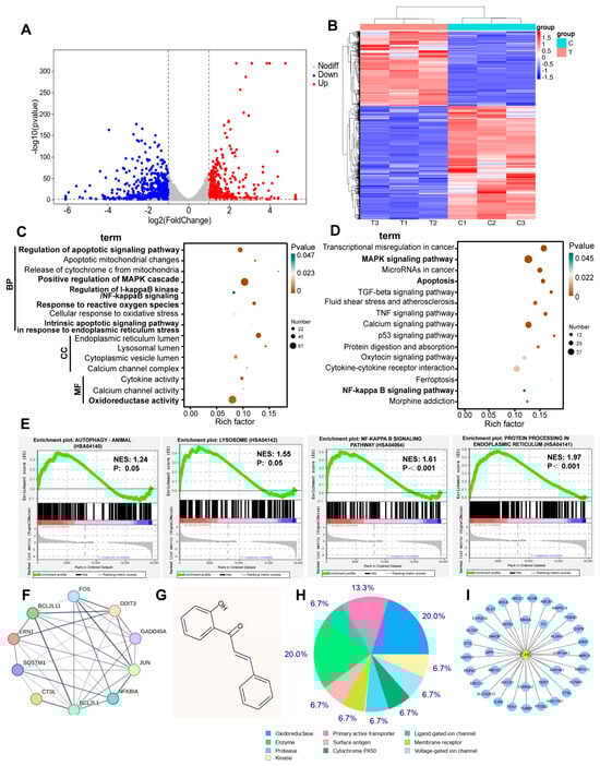 Transcriptomic changes in 2’-HC-treated breast cancer cells and network pharmacological analysis of 2’-HC. (A) Volcano plot and (B) cluster analysis indicated upregulated and downregulated DEPs of MCF-7 cells. (C,D) The results of GO and KEGG analysis of all DEPs in 2’-HC-treated group. (E) Gene Set Enrichment Analysis (GSEA). NES: normalized enrichment score; p: nominal p-value. (F) The protein–protein interaction network of hub genes analyzed with STRING. (G) The chemical structural formula of 2’-TC attained from PubChem. (H,I) Results of the potential target genes of 2’-HC predicted with SwissTargetPrediction. MCF-7 cells were treated with 30 μM of 2’-HC for 24 h. There were three duplicate samples in each group (n = 3).