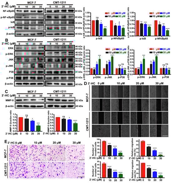 2’-HC regulated MAPK/NF-κB signaling pathways and inhibited migration/invasion of breast cancer cells. (A–C) Western blot analyses of MCF-7 and CMT-1211 cells treated with 2’-HC for 24 h. β-actin was used as an internal control. p-NF-κBp65 and p-IκB (A); p-ERK, p-JNK, and p-P38 (B); MMP-9 (C). (D) Wound healing assay of MCF-7 and CMT-1211 cells treated with 2’-HC for 24 h to measure the cell migration ability. Scale bar: 100 μm. (E) Transwell assay of MCF-7 and CMT-1211 cells treated with 2’-HC for 24 h to measure the cell invasion ability. Scale bar: 200 μm (MCF-7); 500 μm (CMT-1211). Results are presented as the mean ± SD of three independent experiments (n = 3). * p < 0.05, ** p < 0.01, *** p < 0.001, **** p < 0.0001, ns (not significant; p ≥ 0.05).