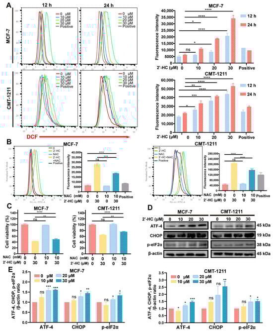 2’-HC increased the intracellular ROS levels and triggered ERS of breast cancer cells. (A) Flow cytometry was used to detect the level of ROS in MCF-7 and CMT-1211 after treatment with different concentrations of 2’-HC for 12 h or 24 h. Rosup was used in the ROS-positive control group at a concentration of 50 μL/mL for 20 min of stimulation. (B) The level of ROS in MCF-7 and CMT-1211 after treatment with 2’-HC and N-acetylcysteine (NAC) alone or in combination. Cells were pretreated with 10 mM NAC for 2 h before being treated with 2’-HC for another 24 h. (C) Cell viability was assessed in MCF-7 and CMT-1211 cells after treatment with 2’-HC and NAC alone or in combination. Cells were pretreated with 10 mM NAC for 2 h before being treated with 30 μM 2’-HC for another 24 h. (D,E) Western blot analyses of ATF-4, CHOP, and p-eIF2α in cells treated with 2’-HC for 24 h. β-actin was used as an internal control. Data are shown as the mean ± SD of three independent experiments (n = 3). * p < 0.05, ** p < 0.01, *** p < 0.001, **** p < 0.0001, ns (not significant; p ≥ 0.05).