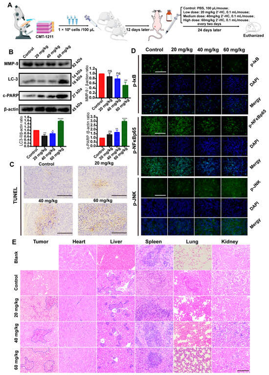 In vivo regulation of 2’-HC in breast cancer. (A) Schematic drawing of the procedure of establishing the xenograft mouse model and drug management. (B) Western blot analyses of MMP-9, LC-3, and c-PARP in tumor tissues. β-actin was used as an internal control. (C) Results of TUNEL assay of tumor tissues. Scale bar: 200 μm. (D) Immunofluorescence staining of p-NF-κBp65, p-IκB, and p-JNK of tumor tissues. Scale bar: 200 μM. (E) Representative panels of H&E staining of tumor and essential organ (heart, liver, spleen, lung, and kidneys) tissues of mice. The area of necrosis in tumor tissues is marked by blue borders. Blue borders in the liver tissues indicate metastatic cells. Scale bar: 200 μm. All results are shown as the mean ± SD of three independent experiments (n = 3). * p < 0.05, ** p < 0.01, **** p < 0.0001, ns (not significant; p ≥ 0.05).