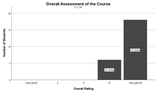 As shown in Figure 1, on a scale from 1 to 5, where 1 represents “very poor” and 5 represents “very good”, 75% (n = 18) of the students rated the course with a 5 in the overall evaluation. A total of 25% rated the course with a 4. The other ratings were not occupied. The mean rating was 4.75 (SD = 0.442). The fact that 75% of the students gave the course the highest rating indicates that the course was overall very well-received. The remaining 25% rated the course with a 4, which is also a positive evaluation. The fact that no lower rating levels were given suggests that all of the (responding) students seemed to have been satisfied with the course.
