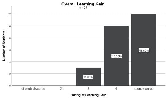 Figure 2 shows how the students rated their learning gain through the PHD curriculum. The extent of learning gain was assessed on a Likert scale from 1 (“strongly disagree”) to 5 (“strongly agree”). In response, 48% (n = 12) of the students chose 5, 40% (n = 10) chose 4, and 12% (n = 3) chose 3, with a mean of 4.36 (SD = 0.700). This result suggests that a significant portion of the students (88%) perceived a substantial learning gain, providing the highest rating of 5 or 4 on the Likert scale.