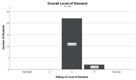 The level of demand for the course was assessed on a scale from 1 (“too high”) to 5 (“too low”) and is shown in Figure 3. A total of 92% of the students rated it as a 3, and 8% rated it as a 4. The mean rating was 3.08 (SD = 0.282). The result indicates that most of the respondents perceived the level of demand for the course as just right. Only 8% would have preferred a slightly higher level. Therefore, the difficulty level was appropriate for the majority of the students.