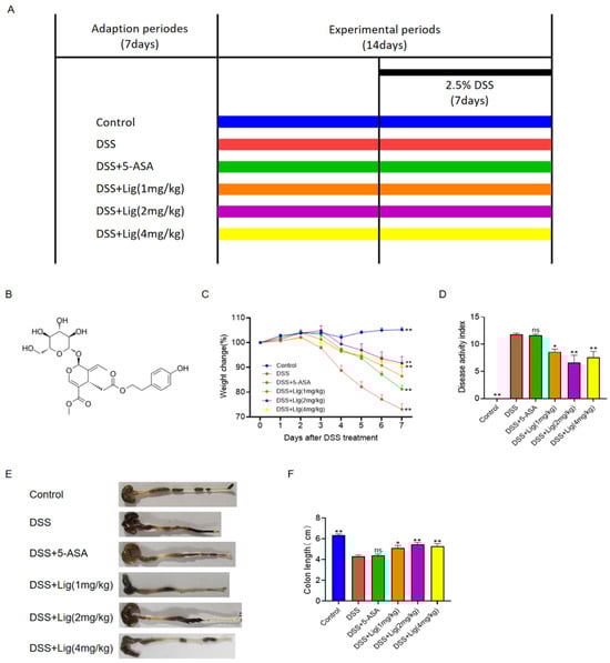Supplementation of ligustroside alleviated colitis symptoms in DSS-treated mice. (A) Treatment timeline for the experiment, (B) chemical structure of ligustroside, (C) body weight change (%), (D) disease activity index scores, (E,F) colon lengths of the mice. * p < 0.05 and ** p < 0.01 vs. DSS group, ns means p > 0.05 vs. DSS group, n = 5.