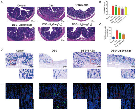 Supplementation of ligustroside alleviated histological changes in colitis mice. (A) Mouse colon morphology stained with hematoxylin and eosin. (B) The histological scores of mouse colon tissue. (C) The number of TUNEL-positive nuclei per field in mouse colon. (D) AB/PAS staining. (E) The TUNEL staining of colon cells. * p < 0.05 and ** p < 0.01 vs. DSS group, ns means p > 0.05 vs. DSS group, n = 5.