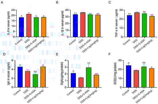 (A–D) Concentrations of IL-6, IL-1β, TNF-α, and IgA in the serum of colitis mice. (E,F) Concentrations of SIgA and SOD in colon tissue of colitis mice. * p < 0.05 and ** p < 0.01 vs. DSS group, ns means p > 0.05 vs. DSS group, n = 5.