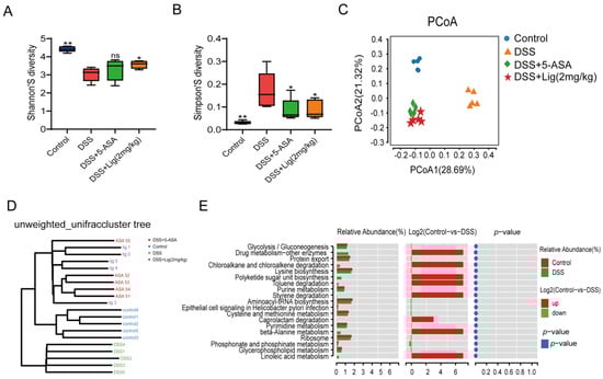The microbiota of mice suffering from colitis were altered by supplementation with ligustroside. (A,B) Shannon and Simpson indices showed alpha diversity, (C) principal co-ordinate analysis of gut microbiota, (D) unweighted_UniFrac cluster tree, (E) functional difference analysis between Control and DSS groups. * p < 0.05 and ** p < 0.01 vs. DSS group, ns means p > 0.05 vs. DSS group, n = 5.