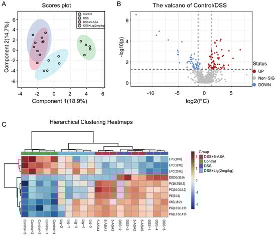 (A) Score plots for the sPLSDA model of metabolites in the intestinal content of mice, (B) volcano plot of significantly different metabolites between the Control and DSS groups (fold change > 1.5 and p < 0.05), (C) hierarchical clustering heatmaps of differential metabolites in intestinal luminal contents of mice between different groups. The red color indicates a metabolite concentration higher than the mean concentration of all samples, and the blue color indicates a metabolite concentration lower than the mean concentration of all samples, n = 5.