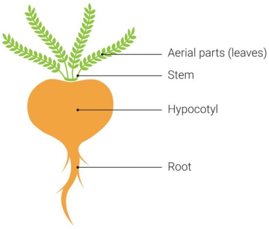 The part of maca used and its growing stage will determine the contents of the end product []. The edible portions are the hypocotyl (tuber) and tap root, while the leaves, flowers, stems, and seeds (contained in a silicle) are less utilized [,] (Figure 1). The size and weight of the hypocotyls can vary [], and it is in this part of the plant where colorful pigments such as carotenoids and anthocyanins are contained in the skin and sometimes the flesh []. Generally, hypocotyls are the plant part of maca harvested and processed for food and supplements, rather than the leaves, which are sometimes used for animal feed []. The hypocotyls are higher in glucosinolates, macaenes, and macamides, and the leaves are noted to have greater beta-sitosterol and total phenols []. The yellow color is typically associated with carotenoids or anthocyanin intermediates, whereas the reddish-purple hue is often due to anthocyanins [,,], yet the analyses for these phytochemicals in each color of maca are lacking. Some anthocyanin compounds would be inherently susceptible to degradation with exposure to heat or water due to their water-soluble nature []. In contrast, carotenoids tend to be fat-soluble and more resistant to the effects of heat [].