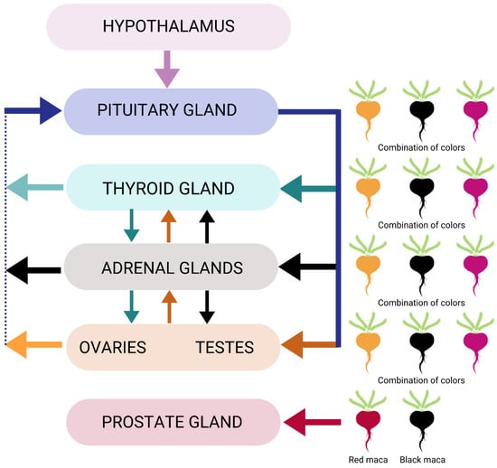 Subsequent clinical studies on Maca-GO® also revealed some degree of positive impact on the thyroid hormone, triiodothyronine (T3), further suggesting that the hypothalamus–pituitary–thyroid–adrenal–gonad (HPTAG) axis may be affected through specific phenotypes and concentrations of maca, though this topic is less studied (Figure 3) [,].