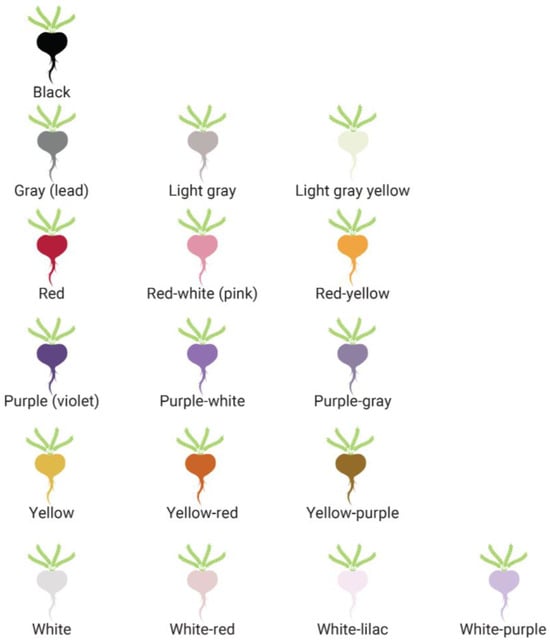 Between thirteen to seventeen different colors (also known as “ecotypes” or phenotypes) of maca hypocotyls have been described [,,,,,,,] (Figure 4). In this paper, “colors” will be used interchangeably with “phenotypes”. The spectrum of colors of the maca hypocotyl that has been identified ranges from white to gray (lead) to black, as well as more colorful varieties such as red, red-white, red-yellow, white-red, white-lilac, white-purple, yellow, yellow-red, yellow-purple, purple (violet), purple-white, purple-gray, light gray, and light-gray-yellow [,,]. Since it would be challenging to visually categorize each of these shades and mixtures of colors as there could be subjective interpretation, the main colors can be consolidated into purple (violet), red, black, white (“creamy white”), gray (also referred to as lead), and yellow [,,]. Most published research features yellow, black, and red/purple varieties [,] (Scheme 2). Pink has also been identified as one of the colors of maca [,,], although no significant research corresponds with this phenotype. The color pigments are only found on the outer layer, with a white inner part; except for yellow, which is also yellow on the inside [].