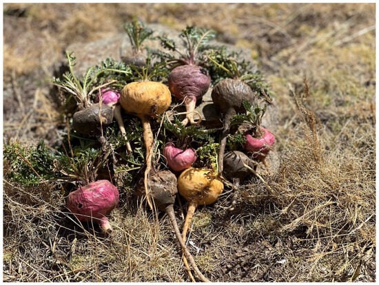 Maca is often planted in the same area in rotation with other crops, although expansion has been needed into other regions within Peru due to increasing demand [,]. As a result of repeat planting, there can be changes in the composition of the soil, the soil microbes, and even the maca phytomicrobiome, which could each conceivably alter the quality of maca and its sensory properties such as flavor [,]. Evaluation of maca from newly cultivated terrains suggests improved sensory quality []. Therefore, best practices are to allow for crop rotation over 4–10 years or more []. Traditional Andean farming practices recommend crop rotation for up to seven years to help reduce pests []. Commercial plantations are rotated on an average of three years due to the depletion of nutrients in the soil [].
