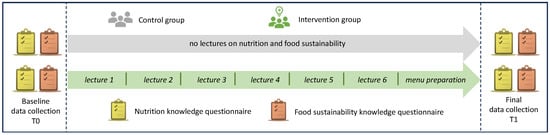 This intervention study was conducted at The School of Italian Culinary Arts—ALMA, based in Colorno (Parma, Italy), recognized as the premier education and training center for the Italian restaurant and hospitality industries at the international level, between April 2021 and October 2022. During this period, all students (18–39 years) registered for the Cooking Techniques, Basic Pastry Techniques, or Advanced Course of Italian Cuisine course at ALMA were invited to participate in the study at the beginning of the course by the nutrition teacher at the school involved in the research project. To obtain a representative sample of ALMA students (n = 966, data referring to year 2019), a sample size of at least 275 students was set, taking into account a confidence level of 95% and confidence interval of 5%. The education intervention was carried out in the Advanced Course of Italian Cuisine as part of the regular teaching program by a teacher in Human Nutrition affiliated with ALMA, and the students taking the course were recruited as the intervention group. On the contrary, the curricula of the Cooking Techniques and Basic Pastry Techniques courses focus on basic knowledge and skills related to the fundamentals of cooking and pastry, respectively, without including lectures on nutrition and food sustainability; therefore, the students who attended them were enrolled as the control group. The flow chart of the study design is presented in Figure 1.