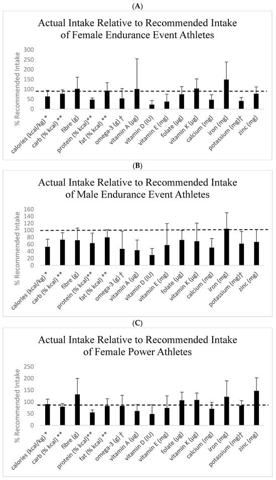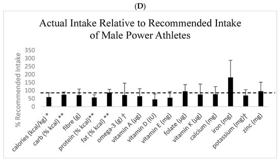 Dietary intakes relative to recommended intakes. Values are means and SD. Recommended intake is indicated as the dashed line at 100%. (A) Female endurance event athletes. (B) Male endurance athletes. (C) Female power athletes. (D) Male power athletes. * Population-specific recommendations [2]; ** acceptable macronutrient distribution range; ⴕ adequate intake. All other nutrients are expressed as a percentage of the recommended dietary intake.