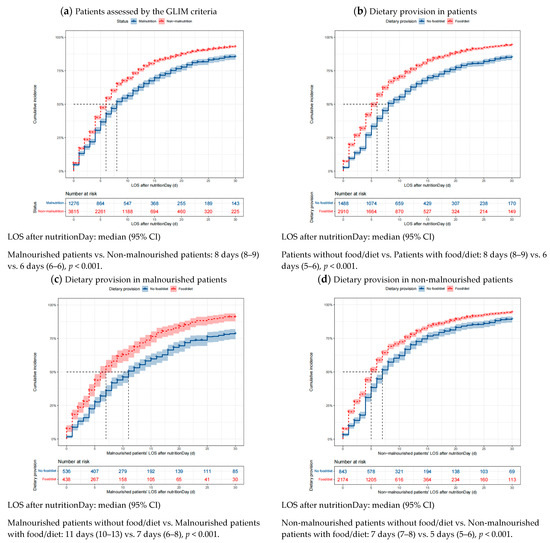 The good 30-day outcomes in patients with different nutritional status and dietary provisions are visualized using cumulative incidence curves in Figure 3. Patients with malnutrition defined using the GLIM criteria had a median LOS of 8 days after nutritionDay, whereas non-malnourished patients had a median LOS of 6 days after nutritionDay (p < 0.001). Similar correlations can be observed for the association between dietary provision and good 30-day outcomes. Moreover, malnourished patients provided with food/diet had a significantly shortened median LOS after nutritionDay compared with those not receiving food/diet (7 days vs. 11 days, p < 0.001). Likewise, non-malnourished patients receiving food/diet also had a significantly shortened median LOS after nutritionDay compared with those not receiving dietary provision (5 days vs. 7 days, p < 0.001).