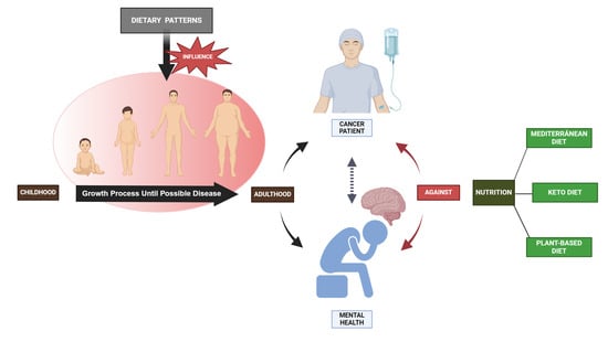 Regarding mental health, observational and intervention studies in nutritional psychiatry have provided increasing data on the significance of one’s diet for mental health outcomes throughout one’s life [181,182]. The correlation between nutrition and mental health is reciprocal: the food we consume has an impact on our mental well-being, and our mental well-being influences our dietary choices and consumption quality. In recent decades, there has been a significant rise in the occurrence of mental health issues [82], such as an increasing prevalence of depression, anxiety, cognitive impairments, and sleep difficulties [183]. The role of the diet and its bioactive components in affecting the development of certain diseases has been acknowledged as a modifiable risk factor [184,185]. According to Hossain et al. (2020), there is mounting evidence that suggests specific eating habits can improve brain health [186]. One such pattern is increasing the consumption of fruits, vegetables, and seafood. According to Román et al. (2019), the MD diet has the potential to prevent depression and maintain cognitive function [187]. Fruits, vegetables, whole grains, seafood, and unsaturated fatty acids are usually more prominent on this diet, and moderate alcohol consumption is encouraged on a regular basis. Breast cancer survivors report reduced cancer-related fatigue if their food is of higher quality after diagnosis [188]. In this regard, a new research study has shown links between nutrition, mental health, and cancer, and it found that cancer patients with Mediterranean diet patterns had a lower incidence of depression (Figure 3) [189]. Nevertheless, in order to provide treatment recommendations based on these findings, more research is needed.