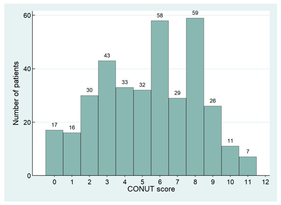 We retrospectively collected 361 patients, including 215 females, with an average age of 79.2 ± 8.0 years. CONUT distribution in the study population is shown in Figure 1. Patients were divided into the following three groups based on CONUT score: 33 (9.1%) were included in the Normal group, 106 (29.4%) in the Mild group, and 222 (61.5%) in the Moderate/Severe group. Baseline characteristics are summarized in Table 2.