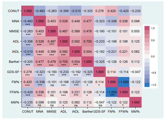 Correlation matrix between CONUT score and clinical characteristics in the study population. CONUT, controlling nutritional status score; MNA, mini nutritional assessment; MMSE, mini-mental state examination; ADL, activity of daily living; IADL, instrumental activity of daily living; GDS-SF, geriatric depression scale short form; FM, fat mass; FFM, free-fat mass; MM, muscle mass. * p < 0.05, *** p < 0.001, ns: not significant.
