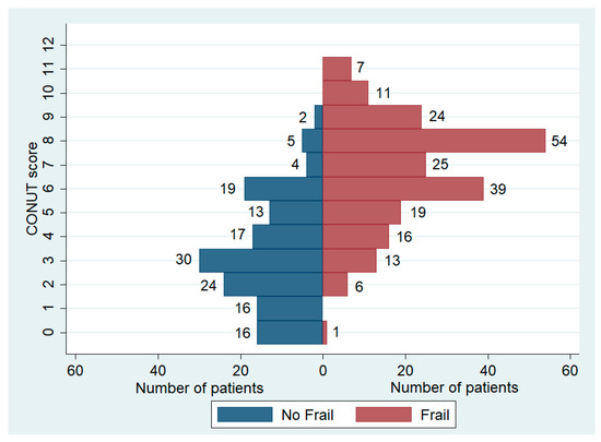 Data were presented as counts and percentages/interquartile range (IQR) for qualitative variables and as mean ± standard deviation (SD) for quantitative variables. The normal distribution of the samples was assessed using the Kolmogorov-Smirnov test. Group comparisons for continuous variables were conducted using either one-way ANOVA or the Kruskal-Wallis test for parametric or non-parametric distributions, respectively. The Tukey test was employed for post-hoc analysis. Nominal and categorical variables were analyzed using Pearson’s Chi-Squared test. Correlation between variables was investigated through Pearson or Spearman coefficients, depending on the distribution of the variables. The performance of the CONUT score in identifying frail patients was assessed through receiver operating characteristic curve (ROC) analysis. p Values < 0.05 were considered statistically significant. Statistical analysis was performed using STATA 14.
