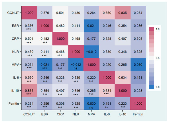 Correlation matrix between CONUT score and inflammatory markers in the study population. CONUT, controlling nutritional status score; ESR, erythrocytes sedimentation rate; CPR, c reactive protein; NLR, Neutrophils/lymphocytes ratio; MPV, main platelet volume; IL, Interleukin. ** p < 0.01, *** p < 0.001, ns: not significant.