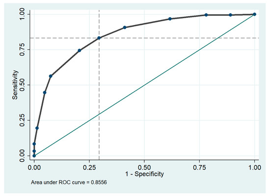 The Receiver Operating Characteristic (ROC) curve identifies a cut-off value ≥5 for the CONUT score, allowing the identification of frail patients with a sensitivity of 83.3% and a specificity of 70.5%. The Area Under the Curve (AUC) is 0.856 (95% CI 0.817 to 0.894), and Youden’s Index is 0.54. The Positive Predictive Value (PPV) stands at 80.6%, the Negative Predictive Value (NPV) at 74.1%, and the Likelihood Ratio is calculated as 2.83 (Figure 7).